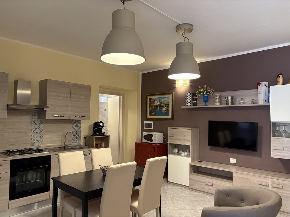 Ampia cucina a penisola con divano e zona pranzo , camera da letto con servizio privato .Smart Tv , Wi-Fi, lavatrice e clima autonomo rendono l’appartamento super funzionale . Max 3 posti letto